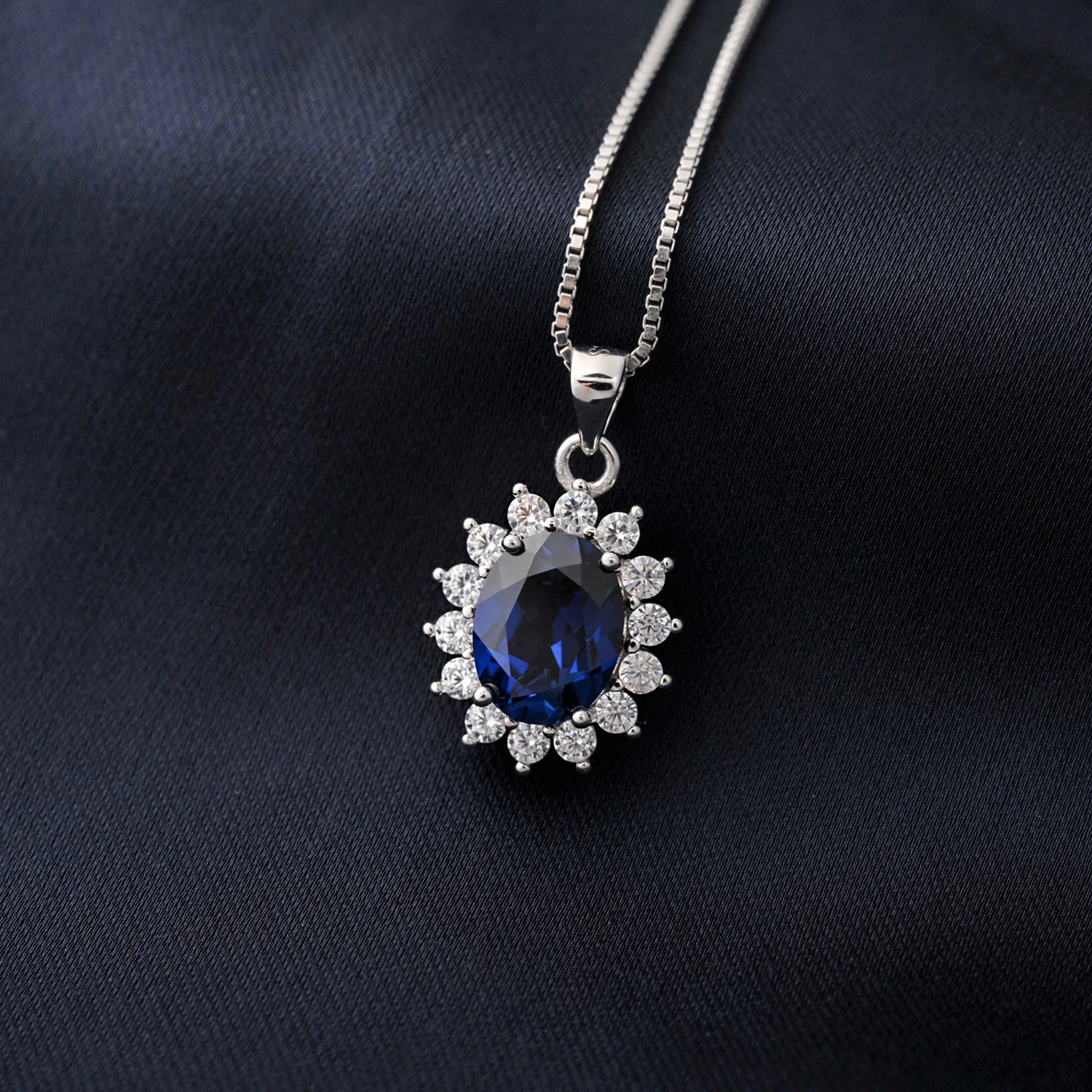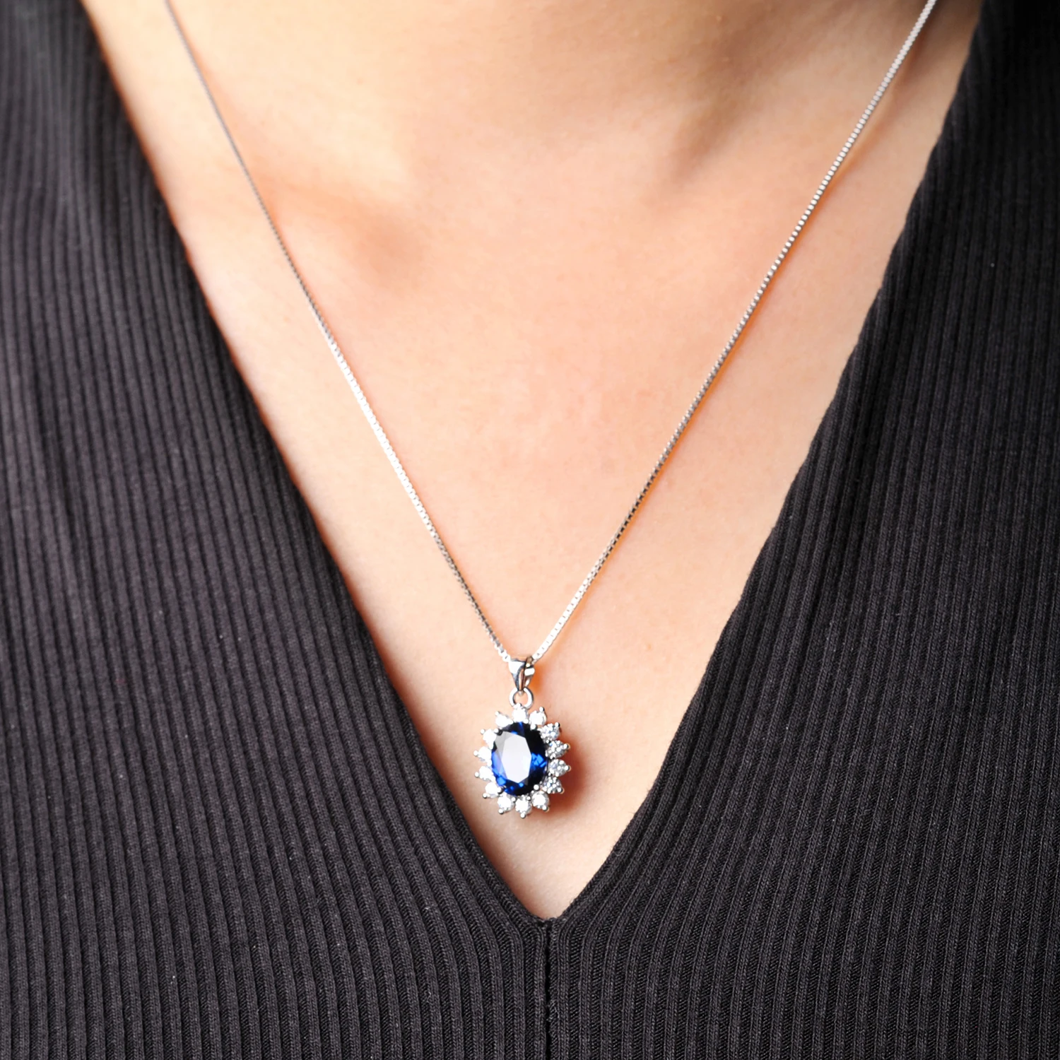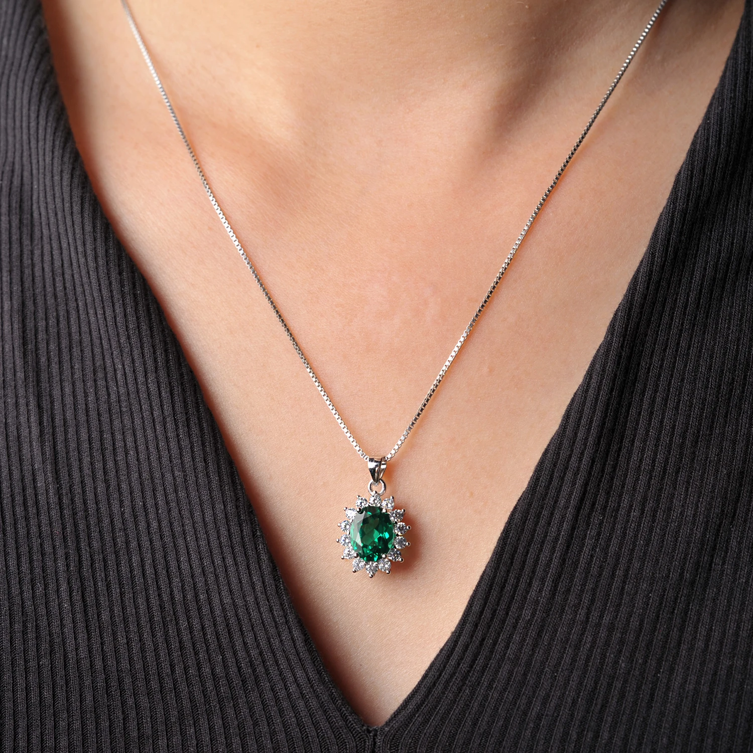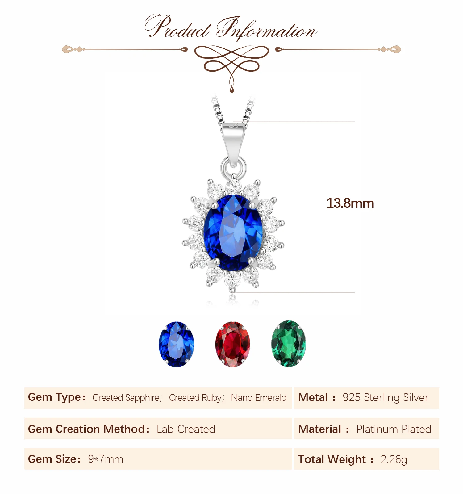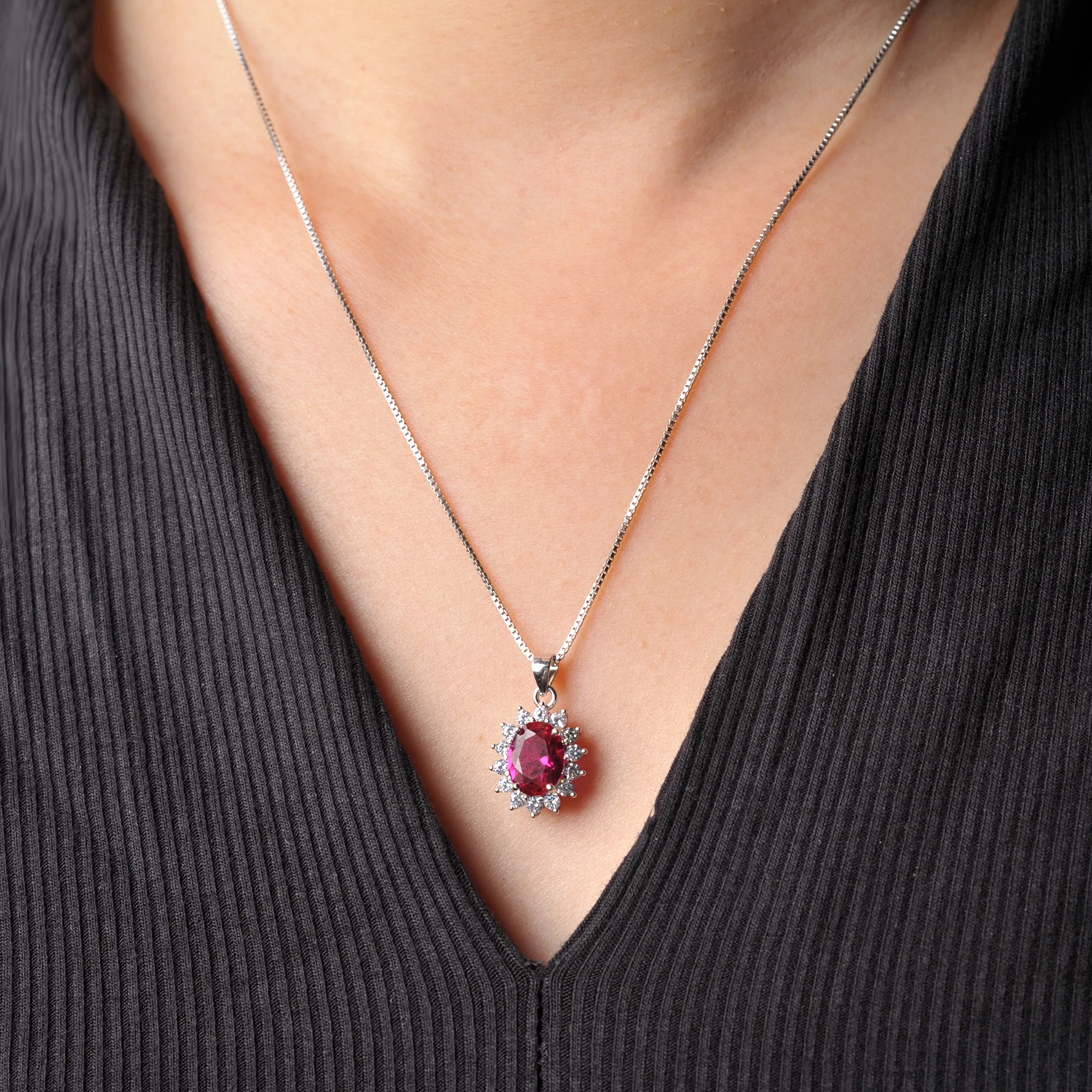 The Royal Starburst Pendant is crafted in genuine 925 Sterling Silver with a refined white gold finish, showcasing a stunning 2.67ct oval-cut gemstone (choice of created sapphire, ruby, or nano emerald) surrounded by a dazzling halo of brilliant cubic zirconia.