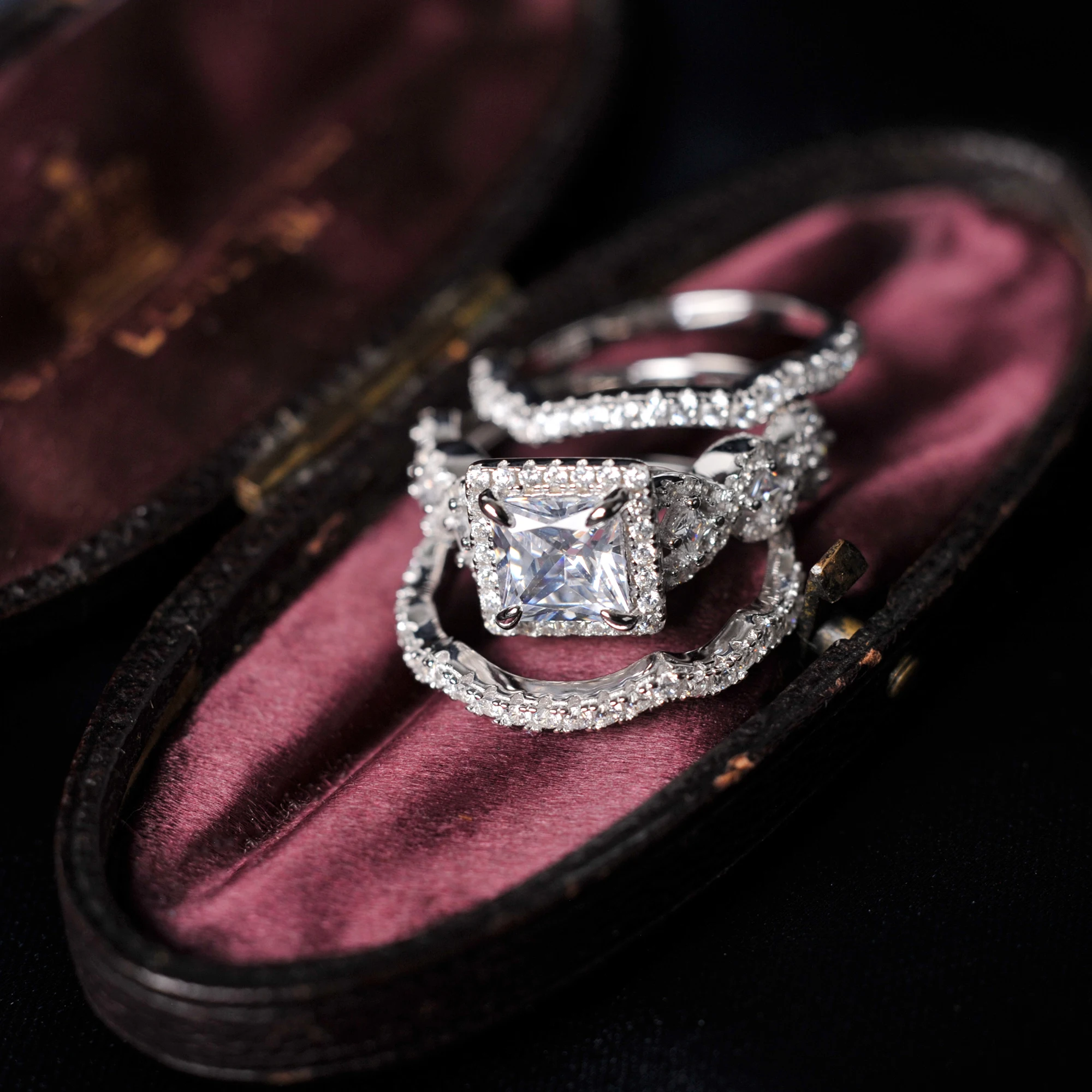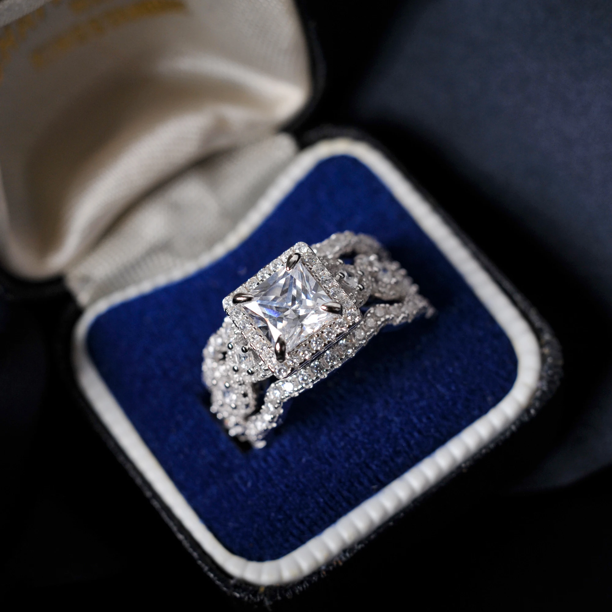 The Imperial Princess Bridal Set is meticulously crafted in genuine 925 Sterling Silver with a luminous white gold finish. The centerpiece features a breathtaking 1.57ct princess-cut cubic zirconia, embraced by a halo of sparkling side stones for maximum brilliance.